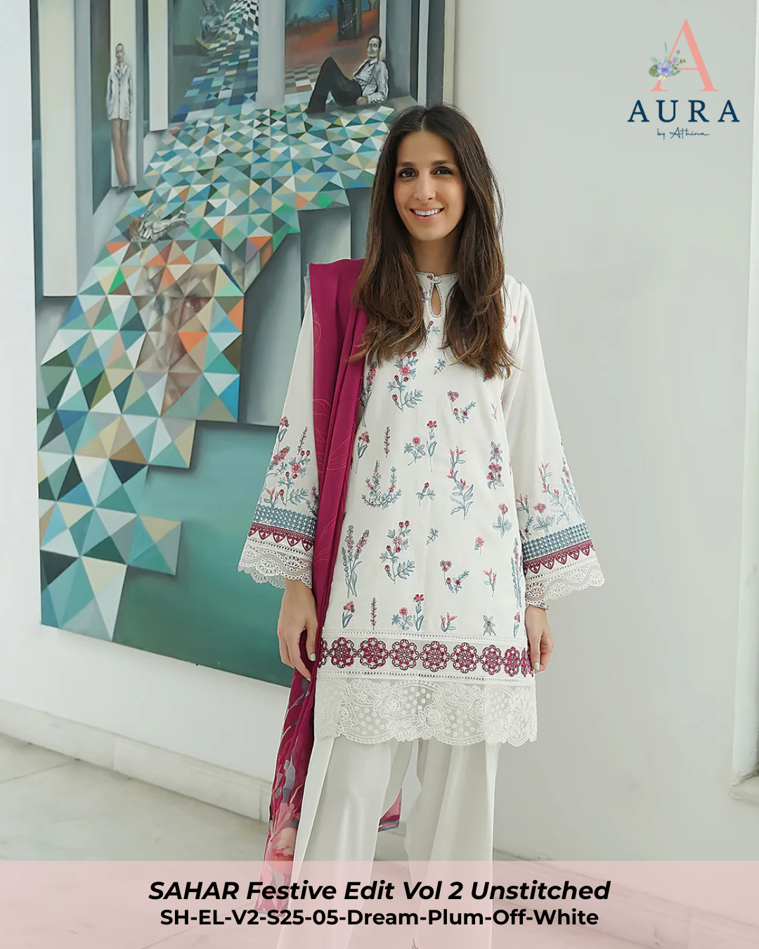 #AuraByAthina #SAHARatAura #DreamPlum #FestiveEditVol2 #UnstitchedElegance #PakistaniFashion #OffWhiteChic #SummerStyle #NewArrival #FestiveReady