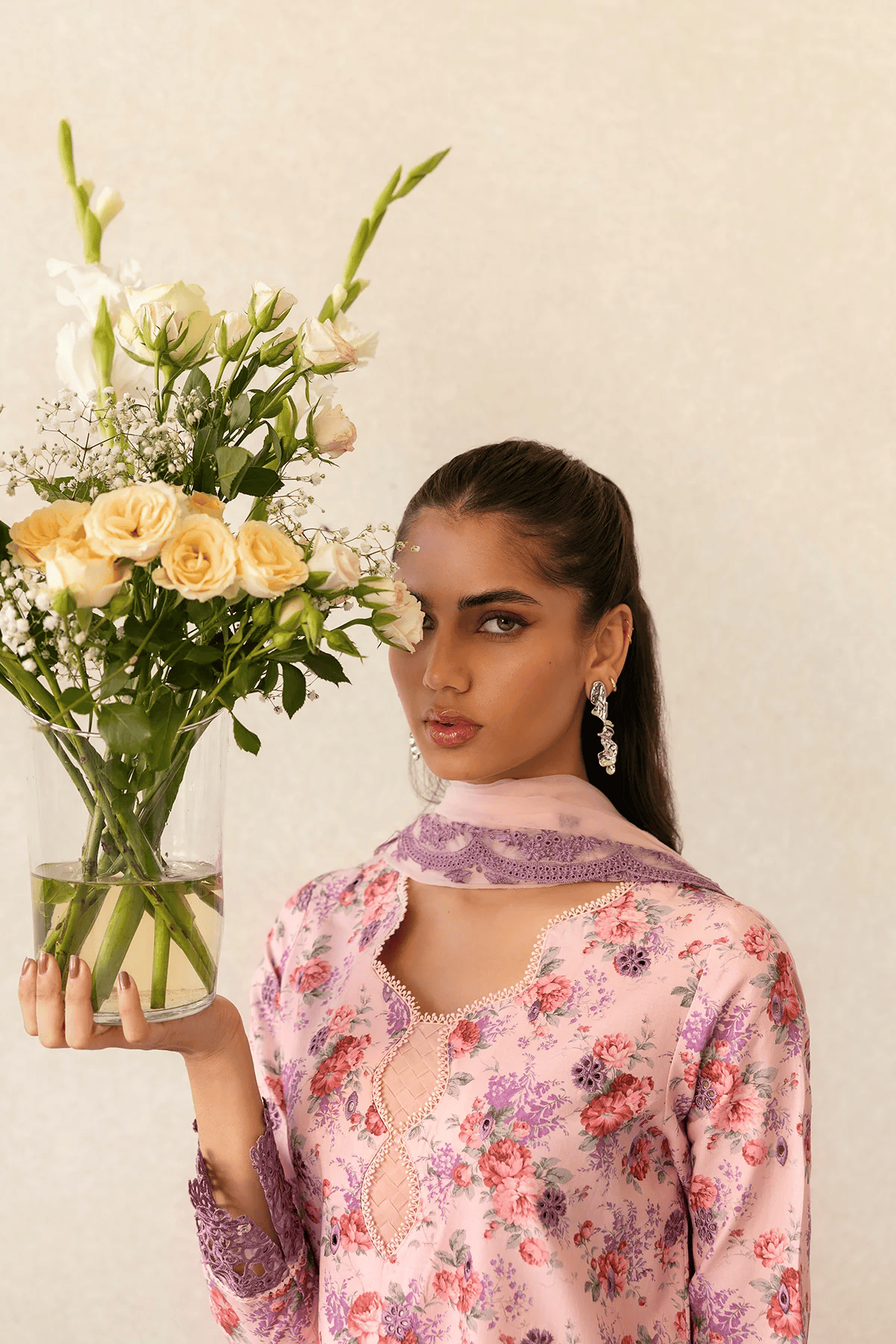 Where daylight fades into elegance—Dusk Laced is a refined celebration of dusky hues and graceful detail. Featuring embroidered digital prints on airy lawn, this look is elevated with tonal organza borders that frame the silhouette with finesse. The embroidered chiffon dupatta flows softly with every step, while the printed cotton trousers offer a polished yet breathable finish.