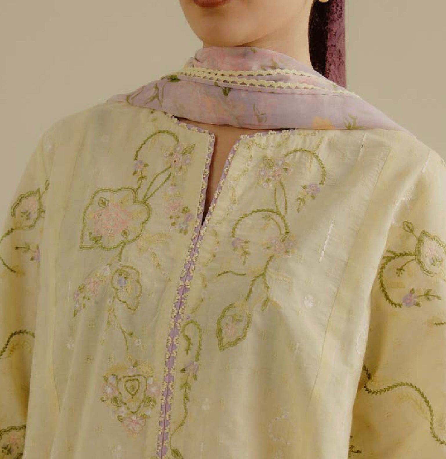 A soft buttercup yellow base adorned with delicate embossed textures and fine tonal embroidery, capturing a light and effortless elegance, finished with a breezy chiffon dupatta for a graceful touch.