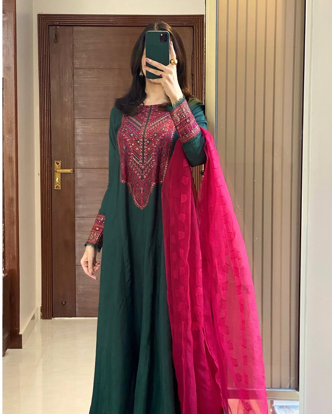 Make an unforgettable statement in this striking crimson 3-piece embroidered outfit. Crafted from premium cambric cotton (100% cotton) and paired with a flowing crinkle chiffon dupatta, it’s the perfect blend of comfort and sophistication for the season.