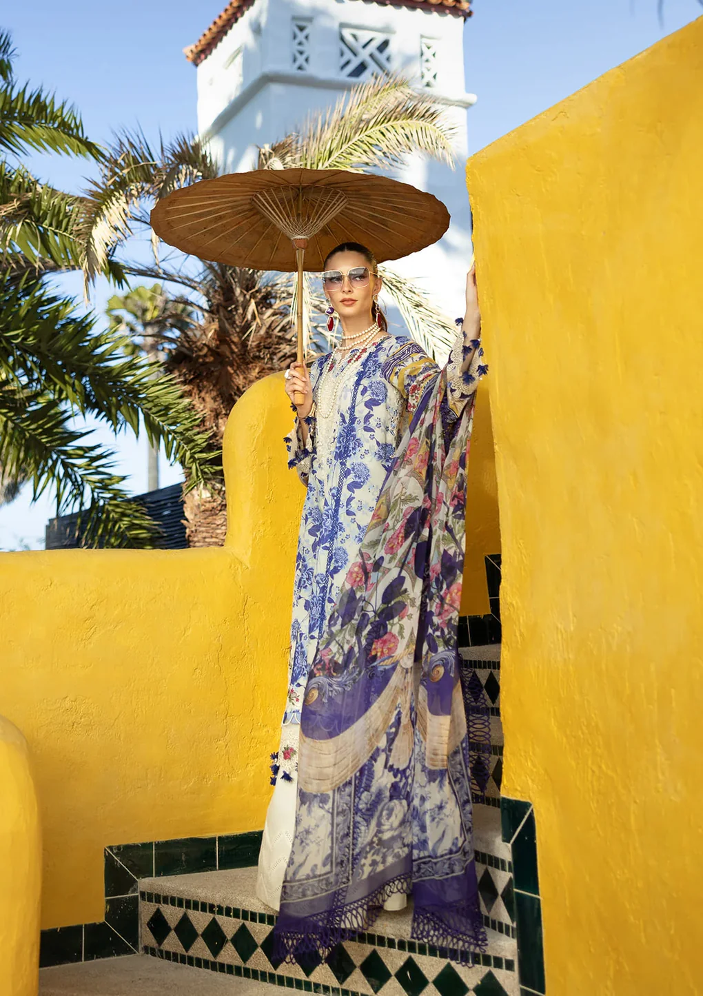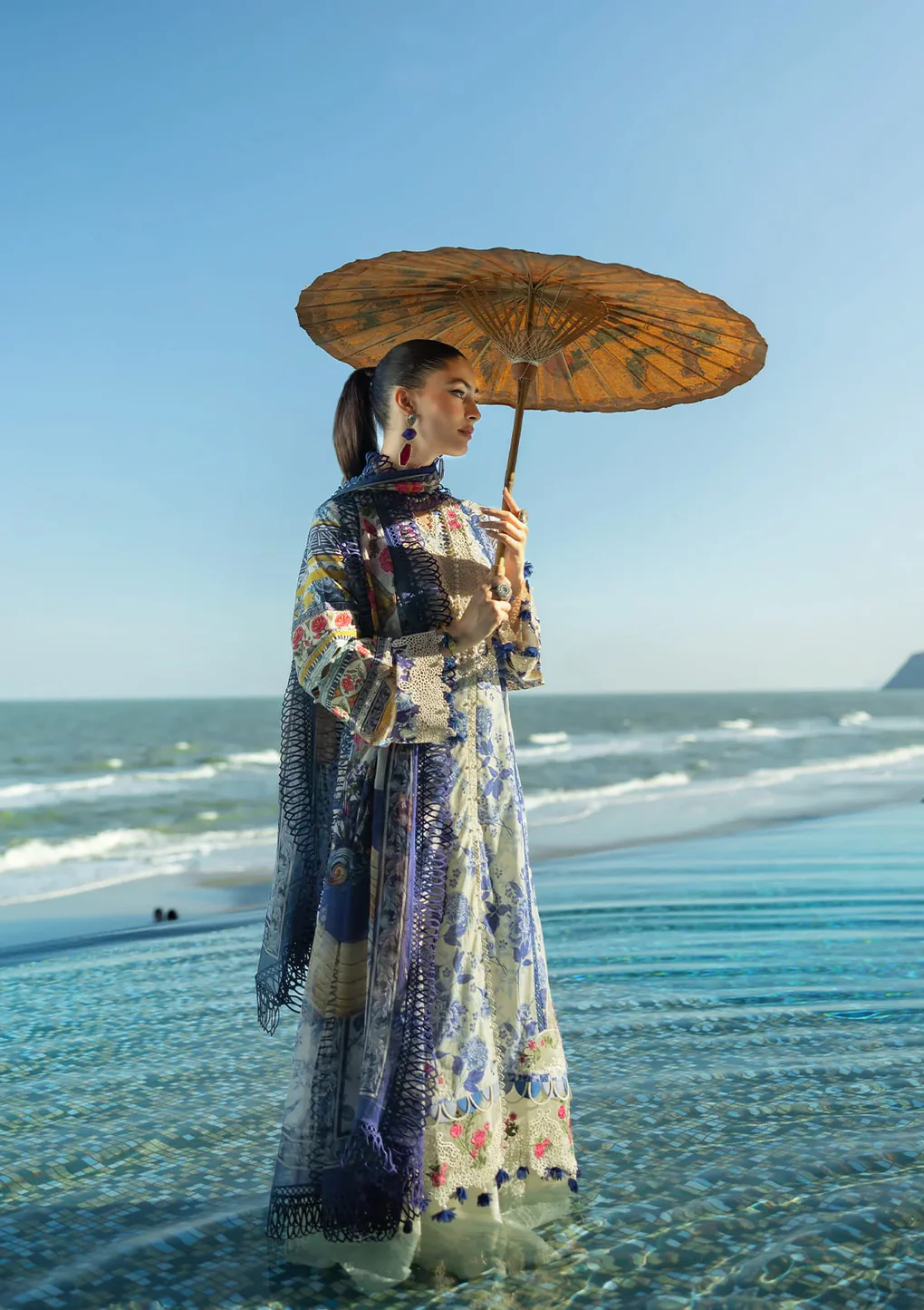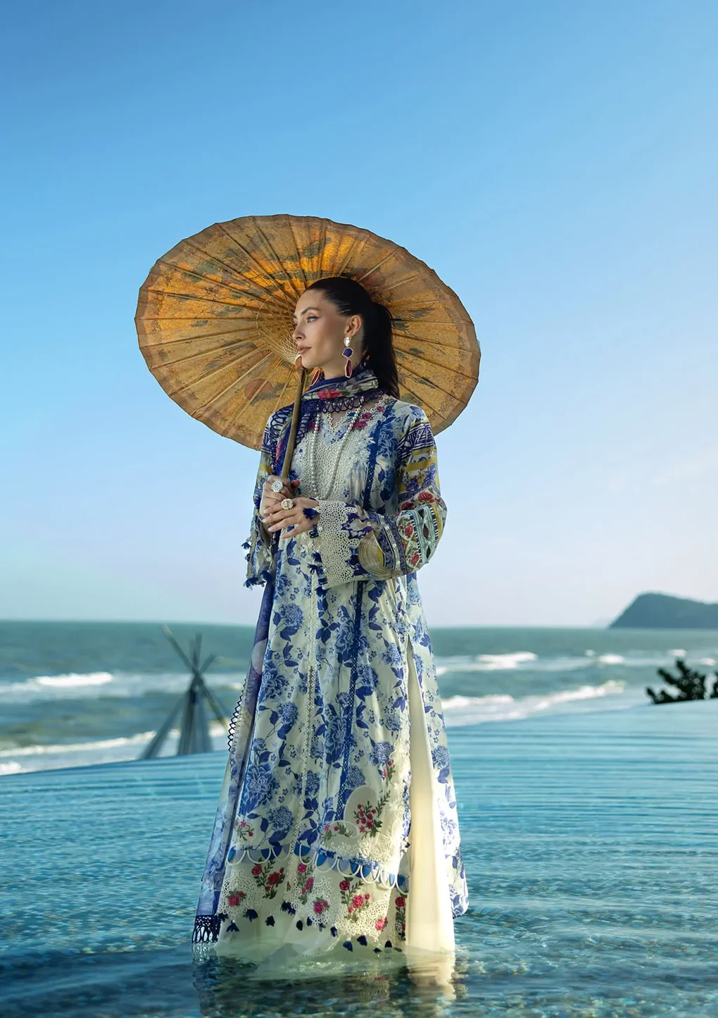 Effortlessly refined, SERENE captures the delicate balance of modern design and classic beauty. Set on a soft off-white canvas, intricate floral patterns unfold in vibrant cobalt blue, with touches of purple and pink adding depth and sophistication. The flowing silhouette is gracefully finished with a printed chiffon dupatta that enhances the ensemble’s captivating charm.