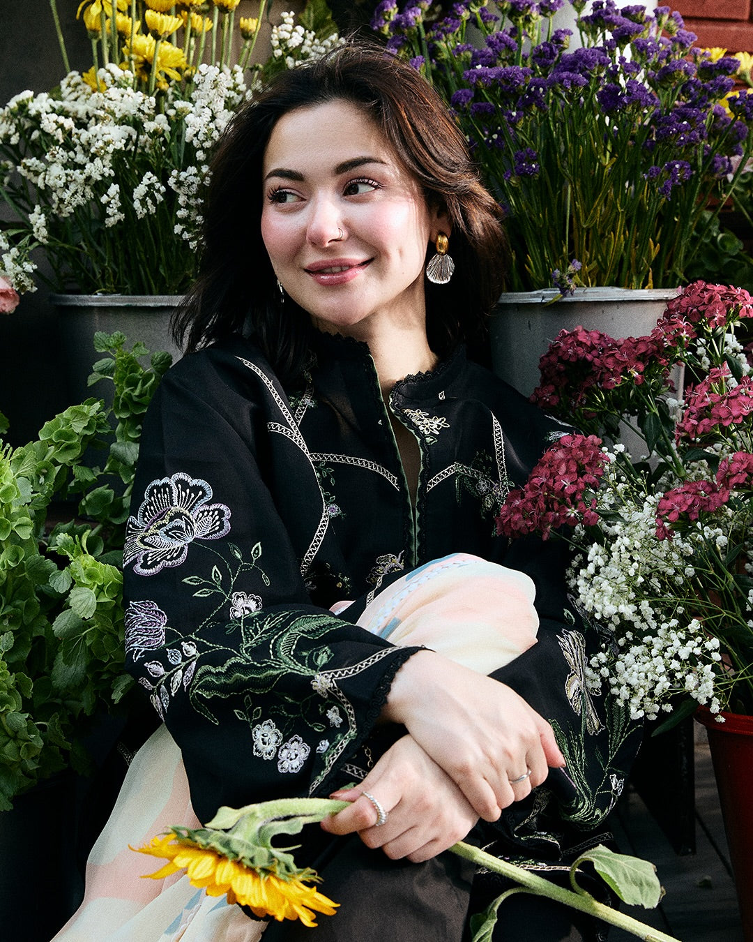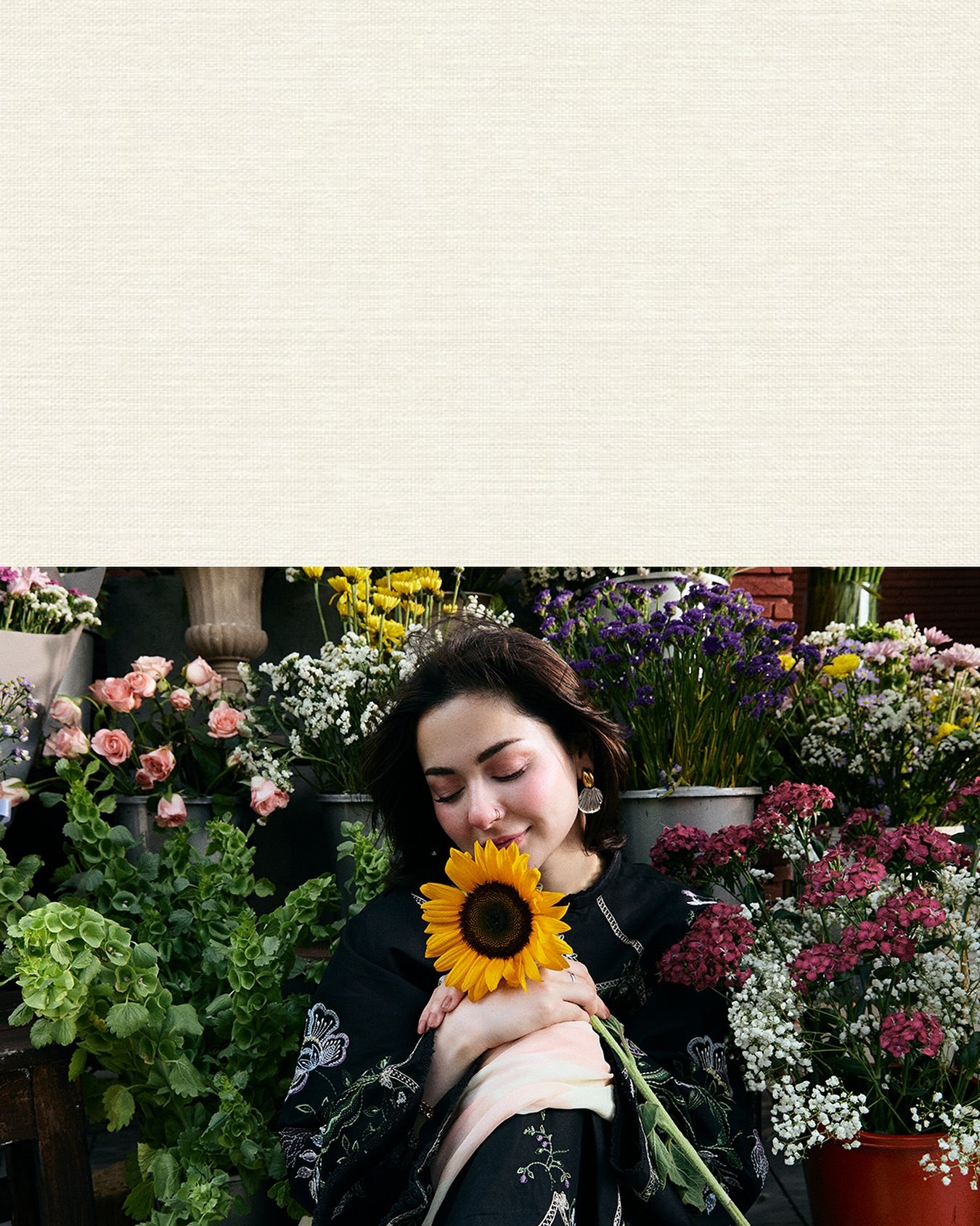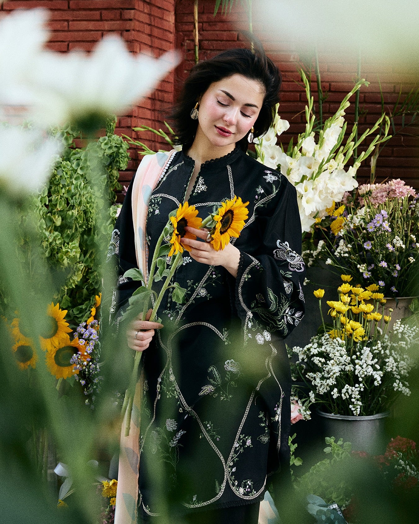 A soft lawn base, paired with a flowing chiffon dupatta, is elevated by subtle pastel detailing contrasted with bold black accents for a modern, graceful look.