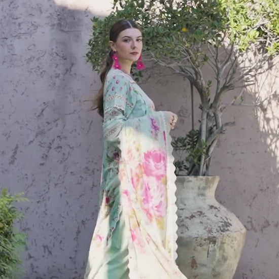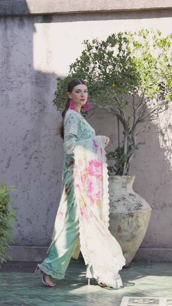 Radiating freshness and gentle sophistication, TURQUOISE offers effortless elegance for sunlit moments. Crafted in a serene aqua hue with vibrant floral prints in lush pink and magenta, this ensemble features a delicately arranged floral pattern that evokes the grace of a summer garden. Enhanced by embroidered organza borders, its soft-flowing silhouette is beautifully complemented by a breezy digital printed chiffon dupatta.