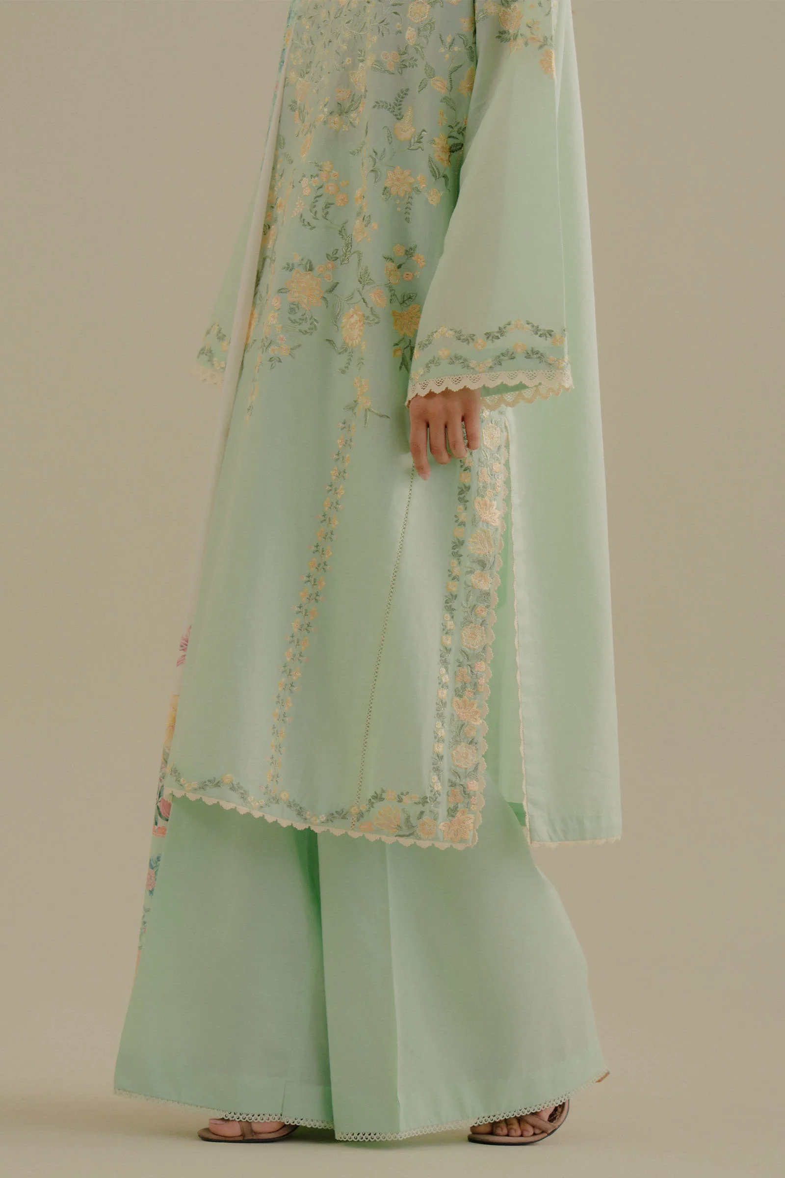 The sea green lawn with yellow detailing, paired with composed embroidery and a heavy neckline, is complemented by a textured jacquard dupatta, creating a bold, refined look.