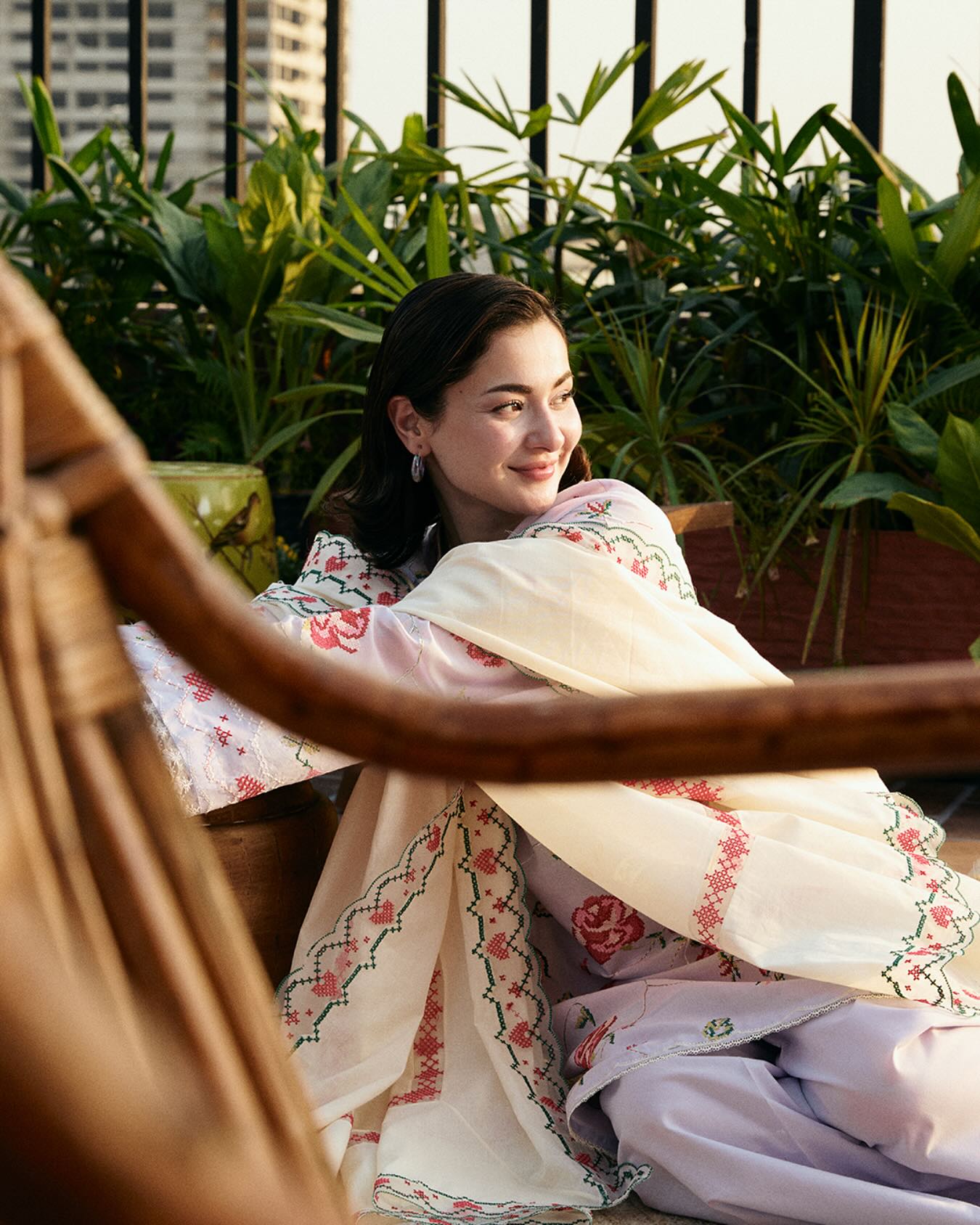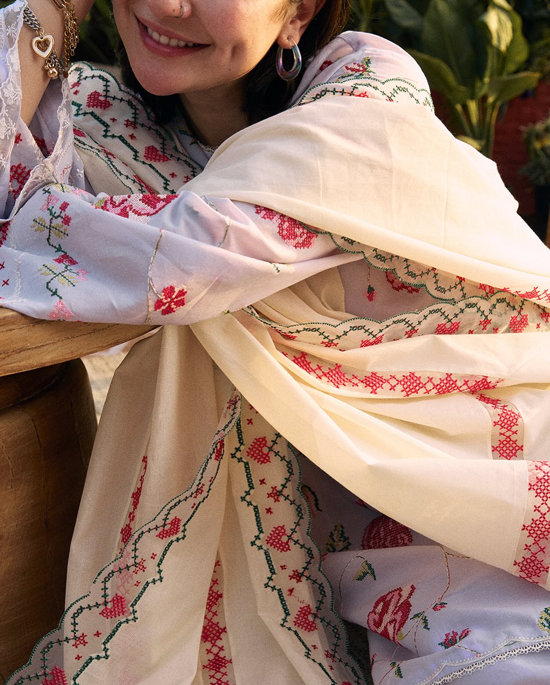 A lilac summer lawn, featuring floral embroidery and a self-jacquard dupatta that exudes a fresh, feminine charm with every detail.